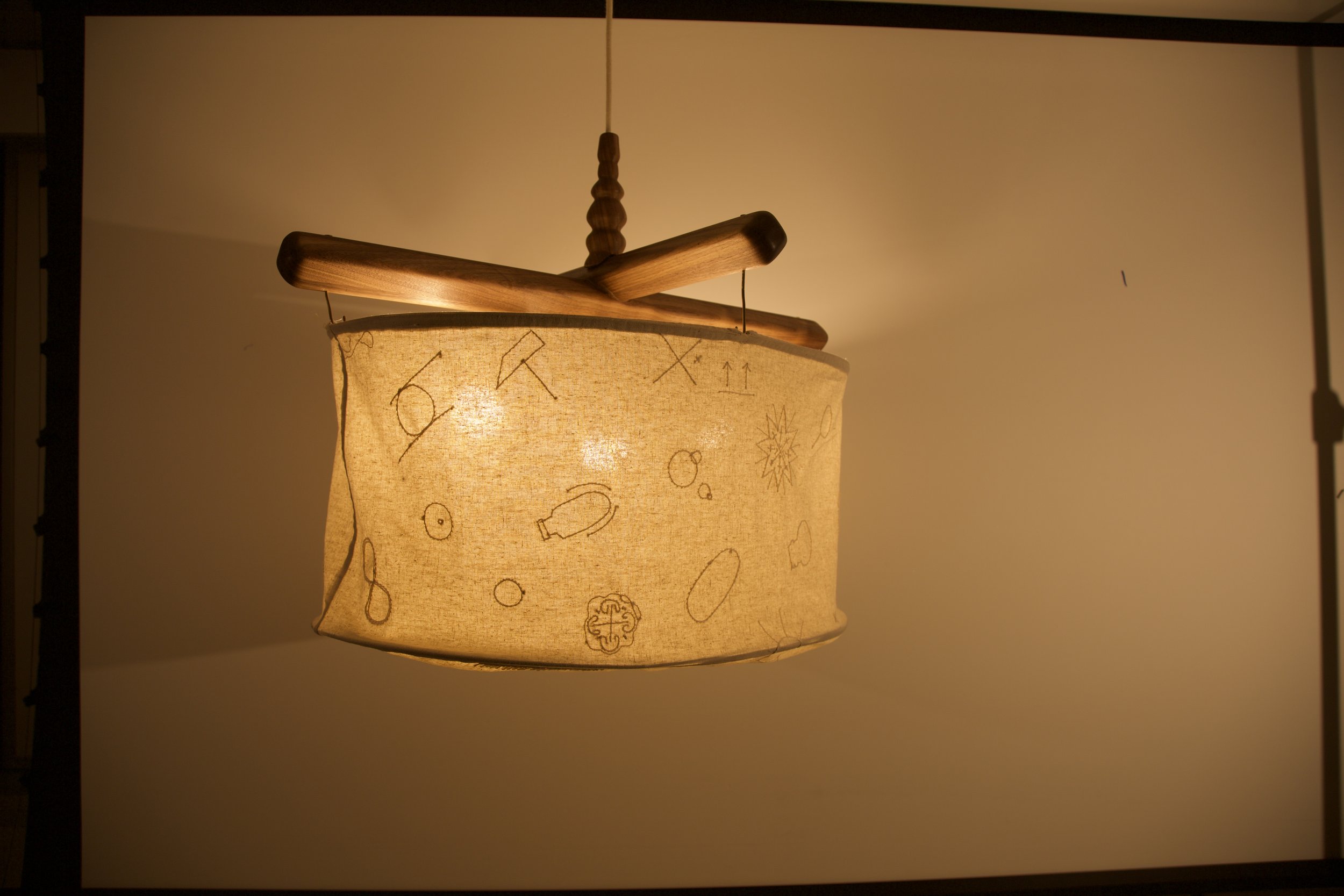 Each embroidered symbol on the lamp shade was taken from or inspired by symbols cataloged in Henry Dreyfuss’s Symbol Sourcebook of historical graphics. Each symbol is in some way relevant to the creation, existence, or form of this lamp.
